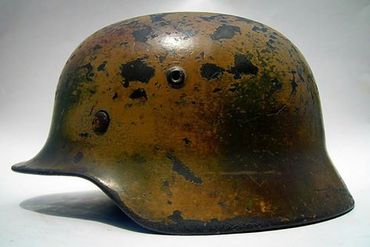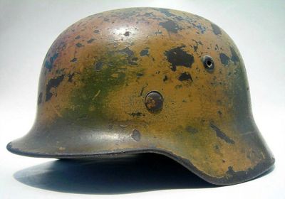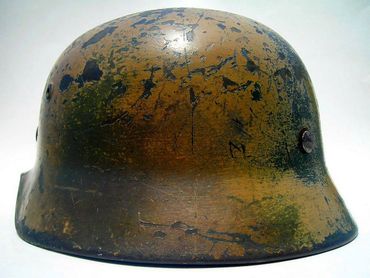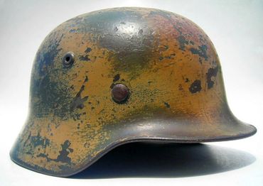ET64 Luftwaffe helmet in a Normandy camo scheme with yellow/tan, grass green, and brick red. Named to Gefreiter Krämer. A true combat vet with loads of character.