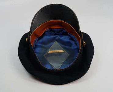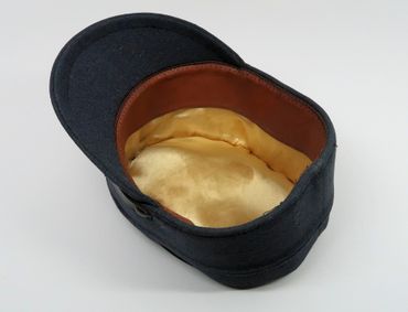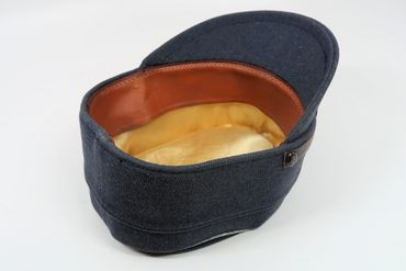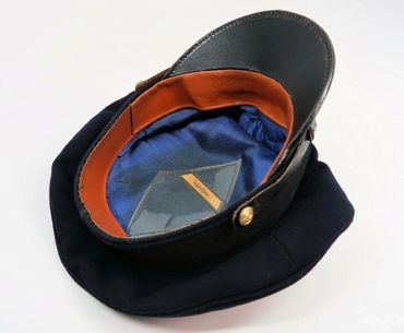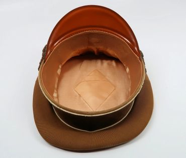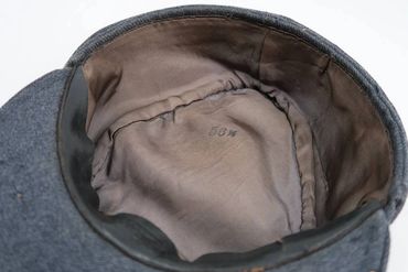 This NSFK officer kepi, often referred to as a 'coffee can' style cap, is an example which was privately made in blue grey trikot wool and lined in a gold colored silk. The cap features a full brown leatherette sweatband, silver metallic silver piping and a black leather chinstrap. The winged eagle was produced in aluminum and is extremely bright.
