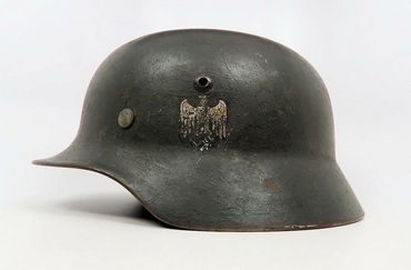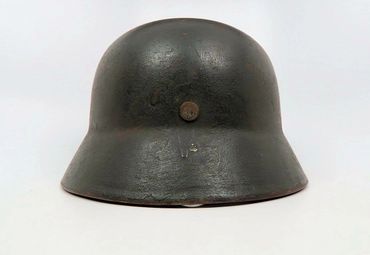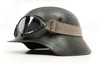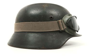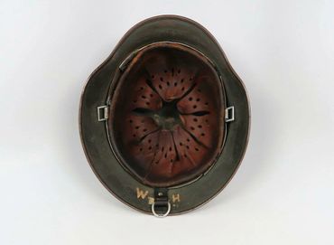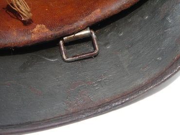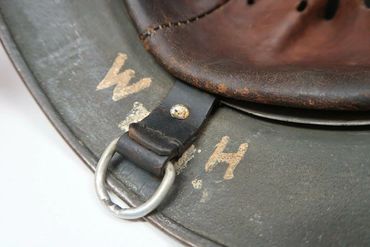 MASSIVE Q68 Heer combat helmet with a size 61 liner. 1937 dated interior liner band on this M35 that was brought up to M40 specs. Numerous repairs including a field-alteration to the liner ring. Also, as can be seen in the photos, is the aluminum combat loop that has been riveted to the underside of the shell. This allowed for a belt clip to be used to hold the helmet while on march. I have added a pair of riding goggles for emphasis. The initials W.H. are painted on the shell's interior rim. If this one could talk...