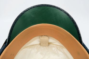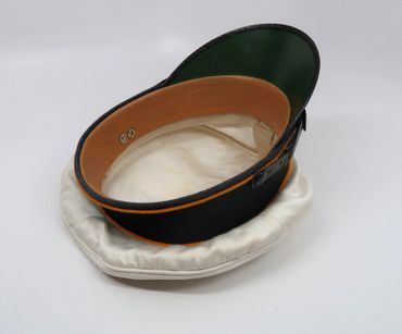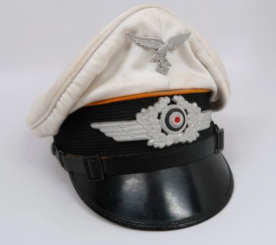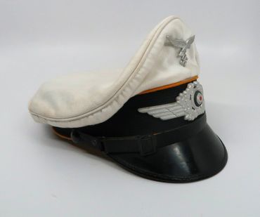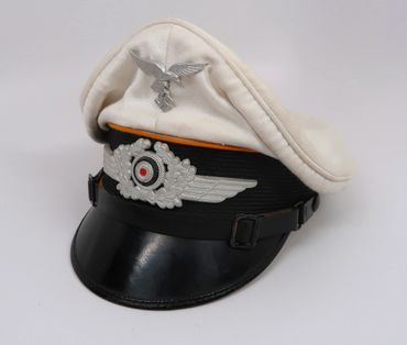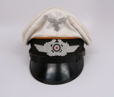 Here we have a lovely white top Luftwaffe visor for flight/para troops. This particular piece sports early aluminum insignia and retains the original wearer's initials of "E.G." on the interior sweatband.