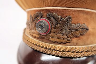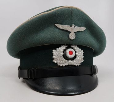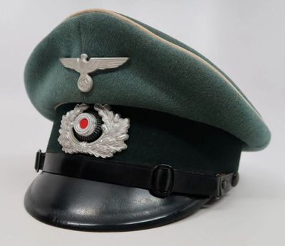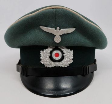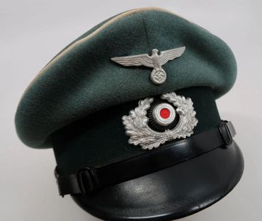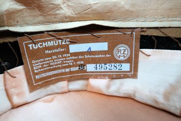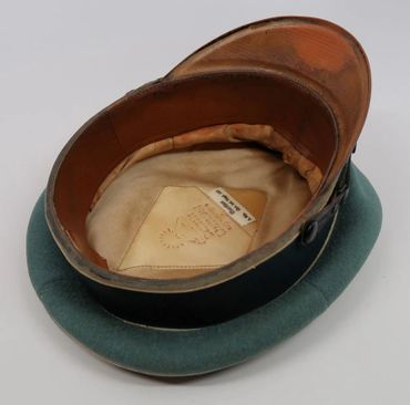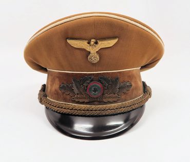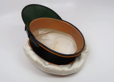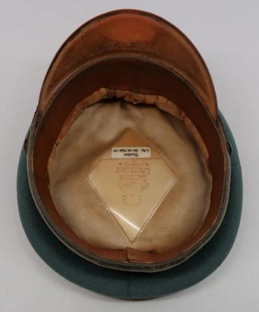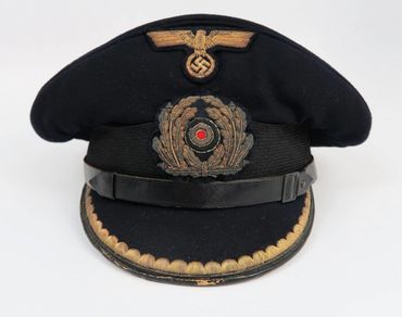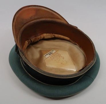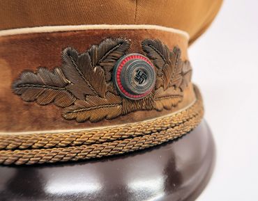 a fairly scarce 1939 pattern Kreis level visor with a wire wreath embroidered directly to the velvet cap band. A beautiful layer of patina covers the gold bullion accents. This exact cap is pictured on pages 125 & 126 of UNIFORMS OF THE NSDAP by Jeff Clark.