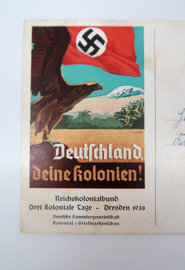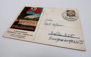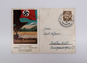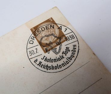 Here we have a postcard for the German colonies in Afrika. I absolutely love the 1938 dated postmark from Dresden featuring a motif for the African continent which is placed over a period Hindenburg stamp. The bright blue/turquoise coloration against the red NSDAP flag really makes the image stand out. I actually have a framed period poster of the same image.