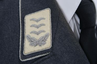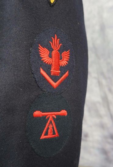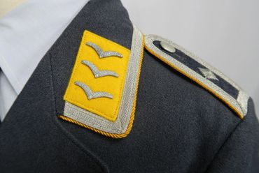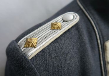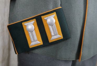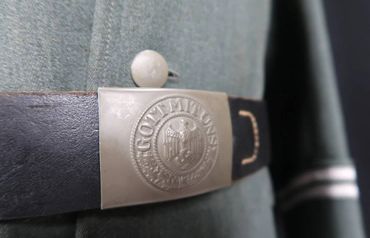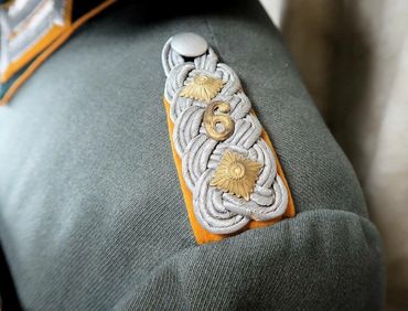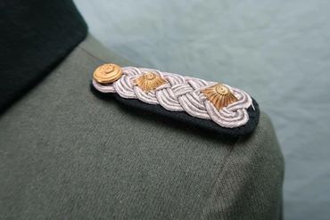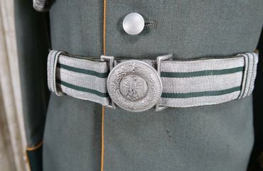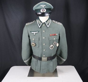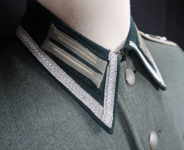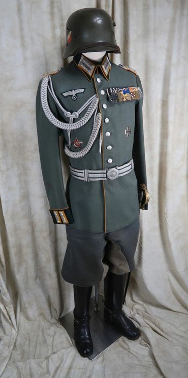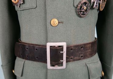 I believe the instructor's ciphers on the shoulder boards would be for Heeresunteroffiziersschule and could be München (although not operational for very long) Mewe, or Marienwerder. I guess it could be possible that this is a machine-gunner's cipher as well and not necessarily a town name. This is a privately tailored piece, I believe from captured Italian gabardine and is of the highest quality. I know technically he should have a pebbled aluminum two-piece walking out buckle for this uniform but I like this way this one matches the matte finish of the buttons.