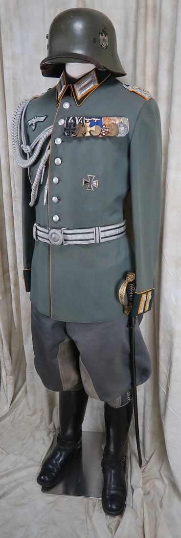 Cavalry Regiment 6 Oberst Waffenrock. While the tunic is named on the interior label I have been unable to make out who exactly this piece originally belonged to but it is one of only a few individuals I have narrowed down. This is setup to date circa 1936-1937 and displays very well. Both the Iron Cross 1st class and Gallipoli star are screw back type pieces. The dress sword is a rare Scharnhorst model from Carl Eickhorn and is of the puma head variety that displays ruby eyes.