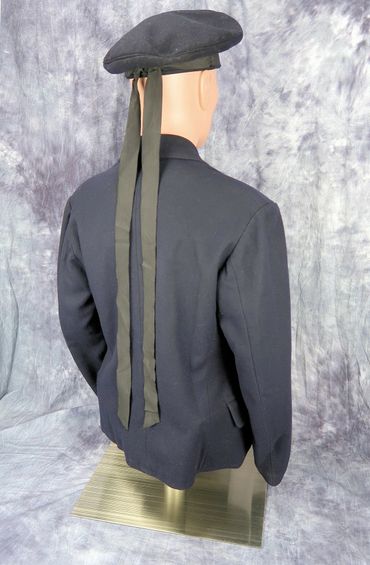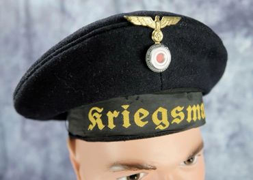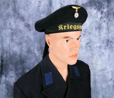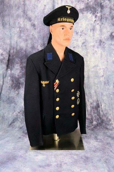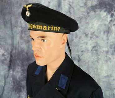 Here is a lovely Kriegsmarine "collani" jacket with Donald Duck style cap within my personal collection. This untouched example came to me through a good friend and because of this it's actually one of my favorite pieces. This particular display wears a very rare Destroyer badge manufactured by the firm of Wilhelm Hobacher of Vienna. This exact badge is shown on page 76 of THE KRIESGMARINE AWARDS, Volume III by Norman Franke & John Robinson. The hat was manufactured in Breda, Holland during the years of German occupation. The sailor was Matrosen HauptsGefreiter (Seaman 1st Class with four years service) and according to his sleeve insignia he was qualified with heavy anti-aircraft guns and also rangefinders.