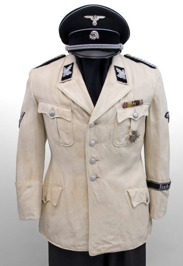 A remarkable set in pristine condition. The display includes a transitional Eickhorn dagger, an early nickel silver buckle by Overhoff and of course the Allgemeine visor. Even the boots in the display are SS marked.