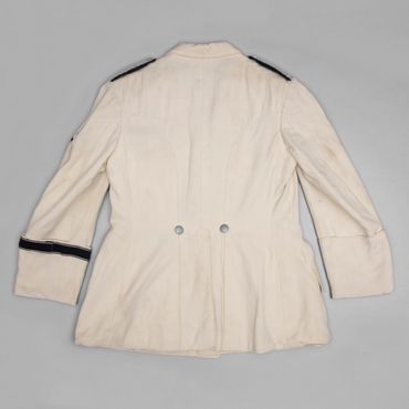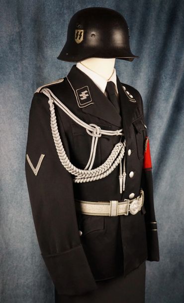 A fantastic ensemble of a prewar member of the Leibstandarte SS Adolf Hitler. The Leibstandarte SS Adolf Hitler (LSSAH) was founded in September 1933 as Adolf Hitler's personal bodyguard formation. The jacket is constructed of fine early quality black wool in the cut of an SS officer's open collar service blouse. The piece features two pleated breast pockets, two lower flapped slash pockets and turn back cuffs. On the upper right sleeve is an Alter Kämpfer chevron indicating membership in the SS prior to 1933 and this is hand sewn to the sleeve. The matched pair of shoulder boards are meticulously sewn into place and show no sign of being disturbed. Both the silver bullion officer’s quality rune tab and the matching rank tab are neatly sewn to the collar. Applied to the left sleeve is a most beautiful multi-piece construction SS member’s armband. The flat wire Adolf Hitler script cuff title is machine sewn to the sleeve. A fine SA sports badge in silver is pinned to the left breast pocket. Also included in the display is an Allgemeine ET64 M16 with satin black over field grey finish and CA Pocher decals which was sourced from a Veteran's estate. The brocade belt is black wool backed and features an aluminum belt buckle produced by Overhoff & Cie. The reverse markings of the buckle suggest the piece was manufactured in the year 1939 and also features the OLC maker logo as well. A most impressive representation of an officer within Adolf Hitler’s personal body guard.